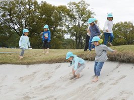 園児たちは歓声を上げながら芝生でかけっこをしたり、段ボールのそりで斜面を滑ったりして遊んだ。富岡保育園(同市市平賀)は年長児35人がバンカーに飛び込んだり、砂で山を作ったりした。同園の園児は「砂で遊ぶのが好きで楽しかった」と笑顔を見せた。