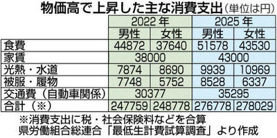岐阜県労働組合総連合(県労連)は14日、県内で若者が1人暮らしをするのにかかる費用を明らかにする、昨年12月時点の「最低生計費試算調査」の結果を発表した。物価高を背景に食費などが上がったことで、前回調査(2022年)に比べ消費支出が12・8%上昇。必要になる賃金と最低賃金を比べると時給で...