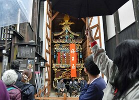 ○…春の高山祭2日目は雨の影響で屋台の曳(ひ)きそろえや御巡幸などが中止となったが、屋台蔵では扉を開いて絢爛(けんらん)豪華な屋台を公開するなどして、観光客らを魅了した。