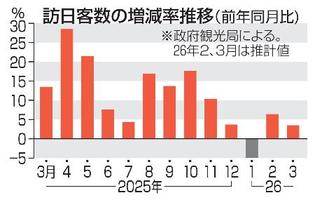 1〜3月の訪日消費額2・5%増 過去3番目の2・3兆円 2026年4月15日 16:29 京都・清水寺近くの二年坂で記念撮影する訪日客=1月 訪日客数の増減率推移 政府は15日、1〜3月の訪日客による消費額(1次速報)が、前年同期比2・5%増の2兆3378億円だったと発表した。四半期別で過去3番目の高水準だった。3月の訪日客も前年同月比3・5%増の推計361万8900人で、3月としては過去最高を記録した。日中関係悪化で中国人客が大きく減ったが、韓国や台湾などが増えて減少分を補った。 今後は中東情勢の混乱に伴う航空便欠航や、運賃高騰などの影響が懸念される。観光庁は状況を注視する。 トップ 全国のニュース 1〜3月の訪日消費額2・5%増 関連記事 パキスタン首相が中東歴訪 トンネルじん肺で7人和解 参院憲法審「合区解消を」 中国で高性能ドローンに熱視線 5月15日にメンバー発表 大阪メトロ社長に角元氏 おすすめ記事 「幸せ」を数値で測る時代! 年収1000万円でも満たされない理由とは 高山祭2日目はあいにくの雨 町には祭りの音が鳴り響く 岐阜県での1人暮らし「月27万円必要」 若者の生計費県労連調査 骨粗しょう症や腎結石の原因「原発性副甲状腺機能亢進症」健診で発見