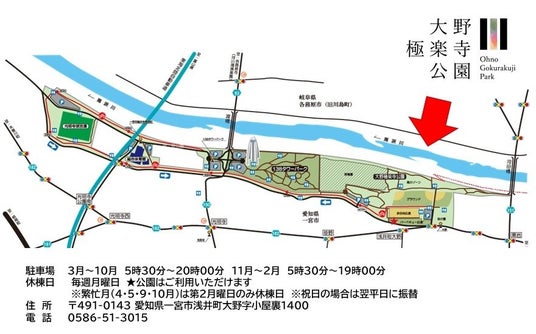 愛知県一宮市における豊かな自然環境を有する木曽川の河川敷に位置し、隣接する国営木曽三川公園三派川地区センター(138タワーパーク)とともに、一宮市の観光、レクリエーション拠点として位置づけられています。春には桜、秋には紅葉が人気。自然に恵まれた園内ではバーベキューやレンタサイクルも楽しめます。駐車場無料。
