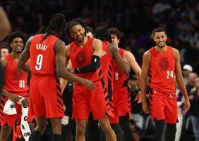 トレイルブレーザーズがPO進出 米プロバスケNBA 2026年4月15日 17:23 プレーオフ進出を決め喜ぶトレイルブレーザーズの選手たち=14日、米フェニックス(ロイター=共同) 米プロバスケットボールNBAのプレーオフ(PO)進出決定戦は14日、フェニックスなどで行われ、西カンファレンスではレギュラーシーズン8位のトレイルブレーザーズが7位のサンズを114―110で破り、PO進出を決めた。 東カンファレンスでは9位のホーネッツが延長の末、10位のヒートに127―126で競り勝った。 サンズとホーネッツは各カンファレンス最後の1枠を懸け、17日の試合に臨む。(共同) トップ 全国のニュース トレイルブレーザーズがPO進出 関連記事 不正ツール提供疑い男逮捕 習氏、ロシア外相と会談 首相「親善の力、活躍を」 消費税ゼロなら地方は2兆円減収 残業指導の運用見直し提言 国内観光業に先行き懸念 おすすめ記事 「幸せ」を数値で測る時代! 年収1000万円でも満たされない理由とは 春の高山祭が閉幕 平日開催に2日目の雨、人出は 高山祭2日目はあいにくの雨 町には祭りの音が鳴り響く 岐阜県での1人暮らし「月27万円必要」 若者の生計費県労連調査