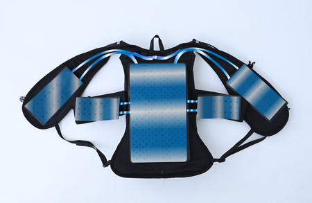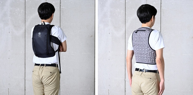 従来モデルはチューブ内を流れる水によって身体を冷却していましたが、本モデルでは背中を面で冷却する水路式構造を採用しました。