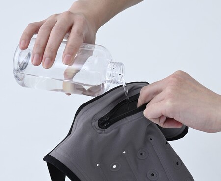 ベスト内部に水を浸透させ、浸透させた水の冷たさと、外側から徐々に蒸発する際の気化熱によって身体を冷やす冷却ウェア。止水ファスナーから水を入れるだけで使用できるシンプルな構造を採用しています。ファン付きウェアのインナーとしても使用でき、暑さ対策アイテムとして幅広いシーンで活用できます。