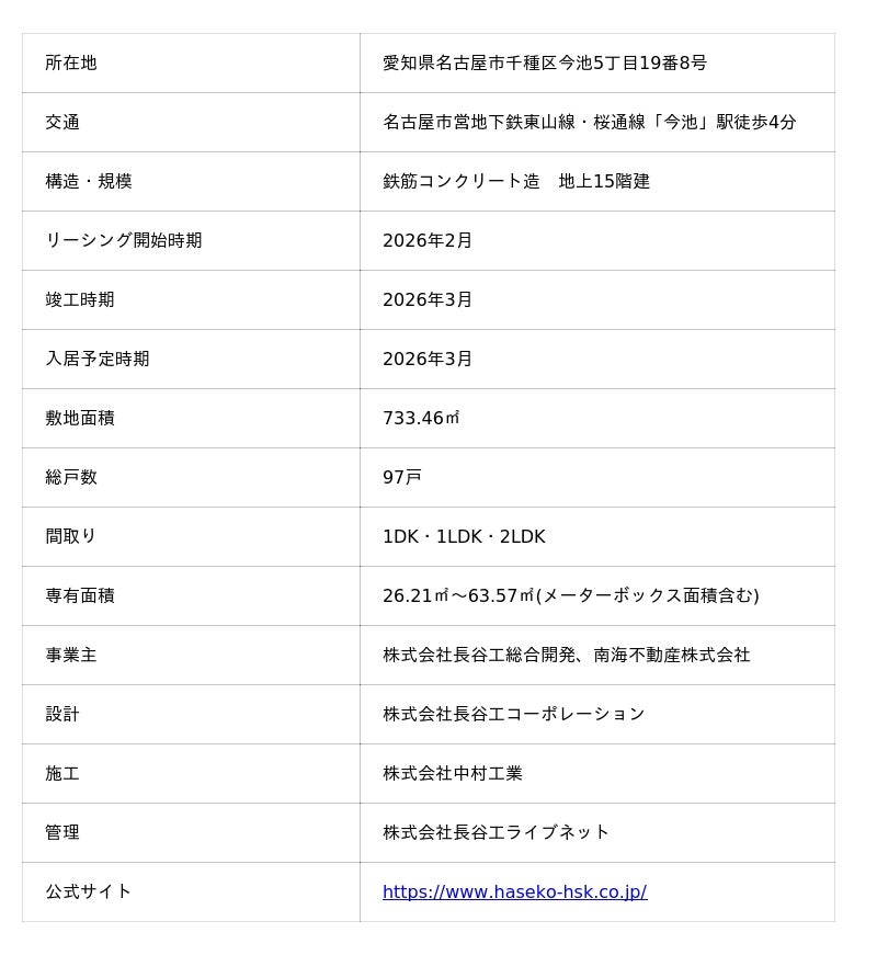 株式会社長谷工総合開発(本社:東京都港区、代表取締役社長:宮原 昭)と南海不動産株式会社(本社:大阪市浪速区、代表取締役社長:村上 一久)は、愛知県名古屋市において新築賃貸マンション「ルネフラッツ今池駅前South」(以下、「本物件」)が竣工しましたことをお知らせいたします。