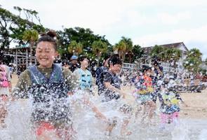 海開きは奄美市のリゾート施設が主催し、奄美海上保安部の関係者ら約30人が参加した。神事後、観光団体の代表が海開きを宣言すると、児童らが砂浜を駆けて海に飛び込んだ。