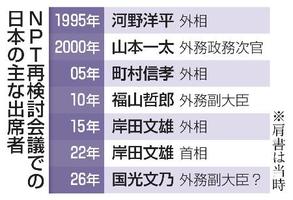 外務省によると、原則5年ごとに開かれる再検討会議に政務レベルの派遣が始まったのは村山政権時代の1995年。条約の無期限延長の是非が焦点となる重要局面で河野洋平外相が出席した。