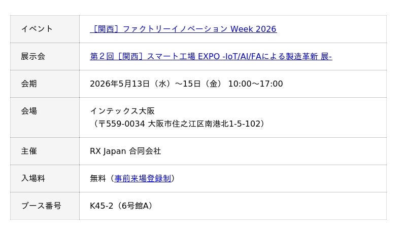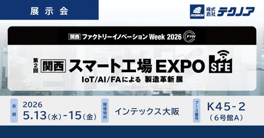 株式会社テクノア(本社:岐阜県岐阜市、代表取締役:山崎 耕治)は、5月13日~15日に インテックス大阪 で開催される「[関西]ファクトリーイノベーション Week 2026」に出展いたします。