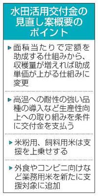 主食用米から飼料用や加工用米などへの転換を支援する「水田活用の直接支払交付金」の見直し案の概要が20日、分かった。生産性向上に取り組むことを条件にし、面積当たりの収量が増えれば助成単価を上げる仕組みに変更する。従来の定額助成を中心とした仕組みを抜本的に見直し、農家の生産意欲向上を図る。農林水産省は2027年度の運用開始を目指している。