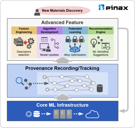 図の説明: 新しいpinaxシステムは3つのレイヤーで構成される:機械学習のコアインフラ(下段)、最終結果に至る推論プロセスを記録・可視化する機能(中段)、そして材料開発のための高度な特徴量レイヤー(上段)である。