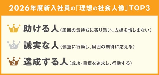 近年、企業を取り巻く環境は不確実性を増しており、新入社員には単に与えられた業務をこなすだけでなく、周囲と協力しながら役割を果たし、継続的に学び成長する姿勢が求められています。こうした中、当社が実施した調査*では、2026年入社の新入社員が描く理想の社会人像として「助ける人(周囲の気持ちに寄り添い、支援を惜しまない)」が2年連続で1位となりました(下図)。若手層の間で、個人で成果を上げること以上に、周囲と支え合いながら成長していきたいという価値観が広がっていることがうかがえます。