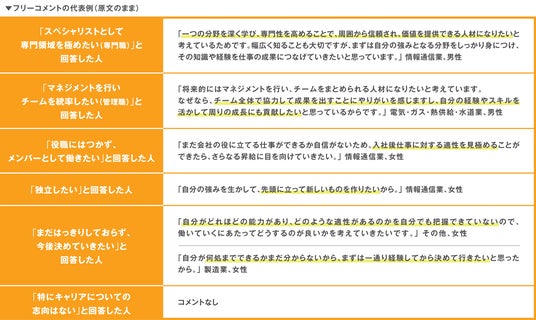 今後、会社で担いたい役割を聞いたところ、「まだはっきりしておらず、今後決めていきたい」と回答した割合が最大になりました。また、約3割がスペシャリスト志向、約2割がマネジメント志向をそれぞれ回答しました。自由回答欄では、これから社会人として様々な経験を積み、自身の適性やキャリアの方向性を見つけていきたいというコメントが多く寄せられました。