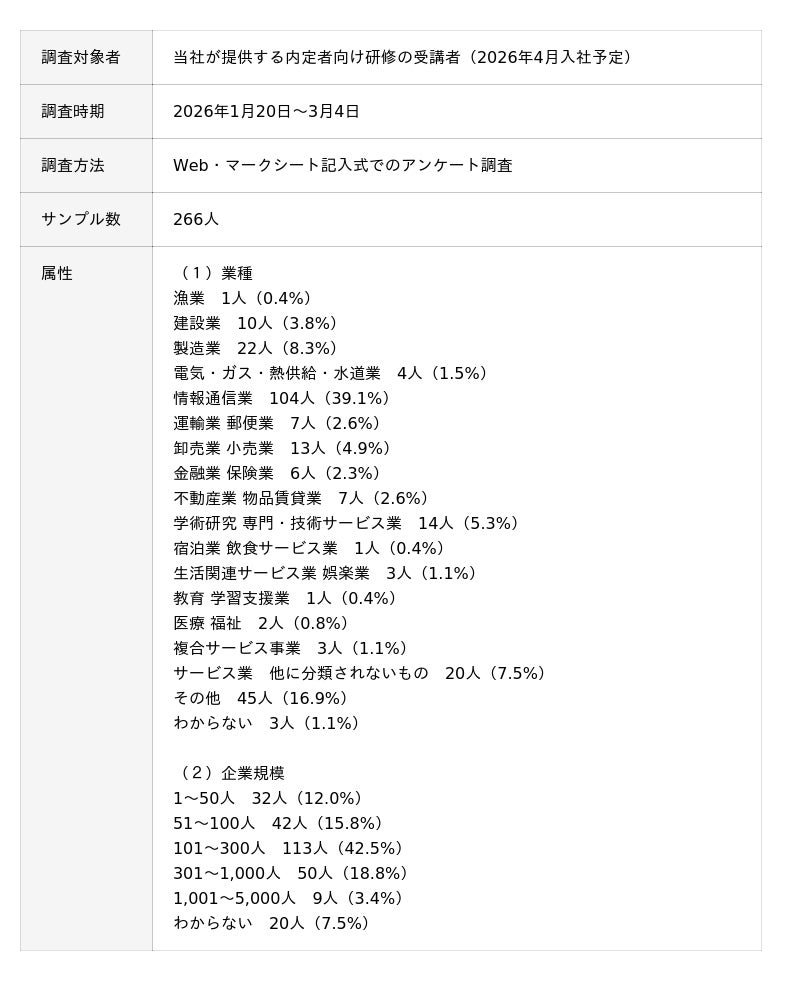 累計20,000社460万人以上の組織開発・人材育成を支援するALL DIFFERENT(オールディファレント)株式会社(所在地:東京都千代田区 代表取締役社長:眞崎大輔)および「人と組織の未来創り(R)」に関する調査・研究を行うラーニングイノベーション総合研究所(R)は、2026年1月20日~3月4日の期間で、2026年に企業に入社する新入社員を対象に、「入社直前意識調査」を行いました。本リリースでは、入社に向けた期待やキャリア志向について調査した結果を公表いたします。