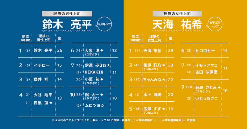 2026年度のトップは、男性上司は鈴木亮平さん、女性上司は天海祐希さん