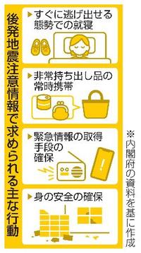 政府が求める備えの対象地域は、北海道から千葉県の7道県の太平洋側沿岸が中心。非常持ち出し品を持ち歩くことや、すぐ逃げられるよう就寝時枕元に靴を置くことを求めている。同時に、避難経路や家具固定の再確認も呼びかけた。