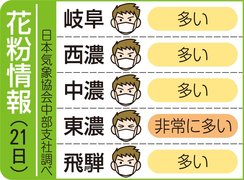 岐阜県内の花粉情報(22日) 2026年4月22日 07:38 岐阜県内の花粉飛散度は、以下の通り... 残り129文字(全文:146文字) この記事をお読みいただくには「デジタルプラン」または「宅配+デジタルプラン」の会員登録が必要です。無料会員の方はログインしてマイページからコース変更してください。デジタルプランまたは宅配+デジタルプランをご登録中の方はログインしてください。 岐阜新聞デジタル会員に登録すると 無料会員向け記事が読める ニュースレターで最新情報が受け取れる デジタルプラン、宅配+デジタルプランなら Webオリジナルコンテンツが読める 紙面ビューアが読める チケットの先行発売に参加できる お得なクーポンが使える 新規登録ページ ログインページ トップ 岐阜のニュース 岐阜県内の花粉情報(22日) 関連記事 高山市の新野球場、本格整備へ 内野は黒土・外野は人工芝【完成予想図 外観やロッカールームなど掲載】 各務原市に「義務教育学校の導入を」 小中学校再編への検討委が中間答申 省エネ家電の購入に補助金 岐阜市が支援キャンペーン FDA、燃油サーチャージを最高水準に 名古屋空港など発着の5月分 伊勢神宮で「木造始祭」 式年遷宮へ岐阜で伐採の御用材 岐阜県内の花粉情報(21日) おすすめ記事 「小1ギャップ」解消へ授業前に自由時間 羽島市、保育園・幼稚園と連携強化 「やっぱ岐阜やて!」ぎふチャンテレビで放送 26日スタート、月1回 浅野撚糸、本社工場を見学可能へ タオル加工見学コース設置 聖地・大垣サウナに行くと人生楽しい! 「サウナ狙いというより…」芸人マグ万平さん熱弁