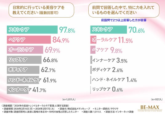 そこで今回、口内から整える夜のインナーケア『BE-MAX BRM PASTE 5000(ベルム ペースト ゴセン)』を販売する株式会社メディキューブ(https://www.be-max.info/)は、美容に興味がある30~50代の女性を対象に、「2026年の美容トレンドとオーラルケア意識」に関する調査を実施しました。