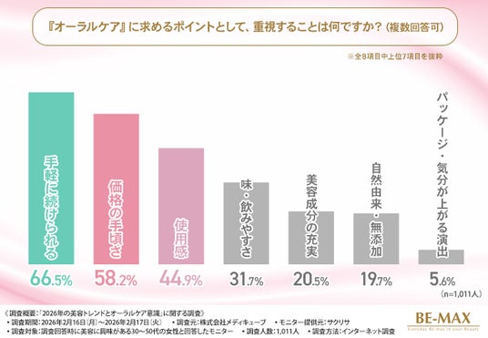 最後に、全員に「『オーラルケア』に求めるポイントとして、重視することは何ですか?(複数回答可)」と質問したところ、『手軽に続けられる(66.5%)』と回答した方が最も多く、『価格の手頃さ(58.2%)』『使用感(44.9%)』となりました。