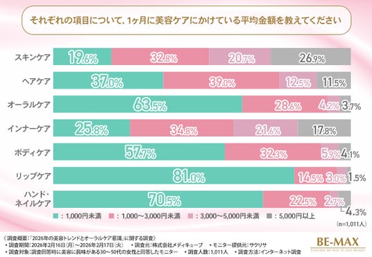 「スキンケア」には約4人に1人が月に『5,000円以上』を費やしているのに対し、「オーラルケア」は『1,000円未満』で済ませる方が6割以上を占めています。