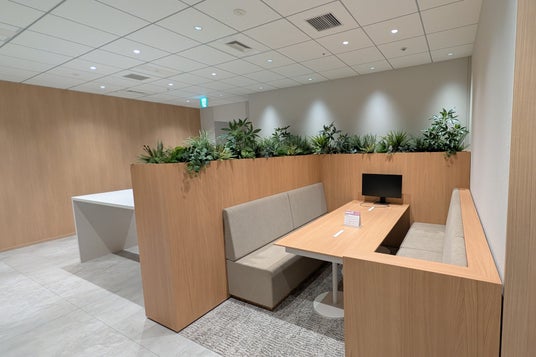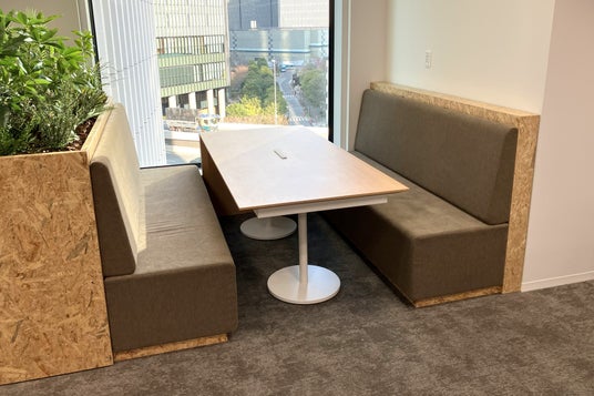 執務エリア: 「工場」としてアイデアを練り、成果を生み出す空間。フリーアドレス席を中心に、少人数用ブースや、窓際に配置されたオープンなミーティングスペースなど、集中とコラボレーションの双方を叶える多様なスペースを用意しています。