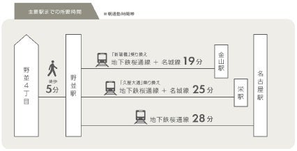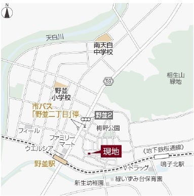 本物件は、地下鉄桜通線「野並」駅から徒歩5分に位置し、名古屋駅まで乗換えなしで約28分と名古屋都心へのアクセスが良好です。周辺には商業施設や医療施設、公園、郵便局が徒歩10分圏内にあるため、生活利便性が高く、暮らしやすい住環境です。