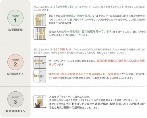 『マモルバ』は、「防犯配慮壁」「防犯配慮ドア」「非常通知ボタン」を備えた、侵入強盗被害から入居者の安全を守るセキュリティ空間です。本物件ではマモルバを採用するほか、屋外センサーカメラやホームセキュリティーサービス(セコム)を採用しており、住まいの防犯性を高めています。
