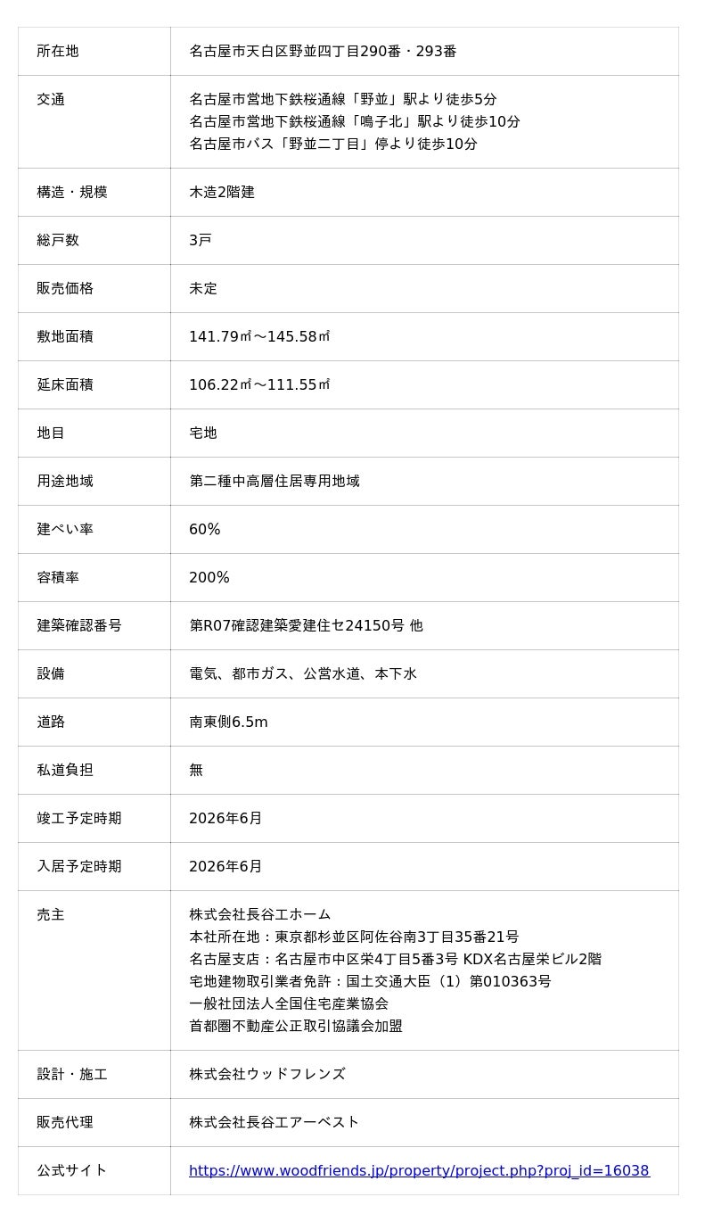 中大規模木造・分譲戸建て事業を統括する中間持株会社として2026年4月1日に設立された株式会社長谷工ホームホールディングス(本社:東京都杉並区 代表取締役社長:野村 孝一郎)傘下の株式会社長谷工ホーム(本社:東京都杉並区 代表取締役社長:野村 孝一郎)と株式会社ウッドフレンズ(本社:愛知県名古屋市中区 代表取締役社長:伊藤 嘉浩)は、初の共同事業となる新築分譲戸建て「天白区野並プロジェクト」(以下、「本物件」)の公式サイトを2026年4月22日より公開しました。販売開始は6月下旬を予定しています。