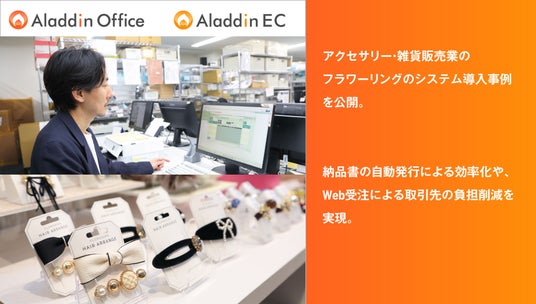 アクセサリーやキャラクターグッズの販売を手掛ける株式会社フラワーリングは、「アラジンオフィス」と「アラジンEC」を導入し、納品書の自動発行により業務の効率化、Web受注により取引先における発注業務の負荷削減を実現しました。