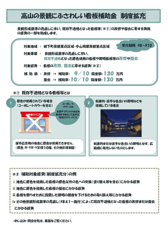 これまでも良好な景観の創出を図るため、高山の景観にふさわしい看板の設置、ふさわしくない看板の撤去に対し、必要となる経費の3分の1以内、限度額18万円の助成を行ってきましたが、さらなる良好な景観の創出を図るため、今回の基準見直しに伴い、これまでの基準では適合していたが、新たな基準になったことで不適格となる看板や夜間景観を阻害している照明看板等について是正して頂く場合の補助金を拡充しました。(令和10年度までの時限措置)