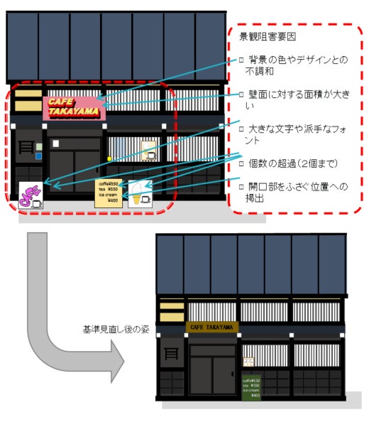 景観形成基準の見直しに伴い基準に適合しなくなった看板の是正と更なる良好な景観の創出を図るため、補助制度を拡充します。