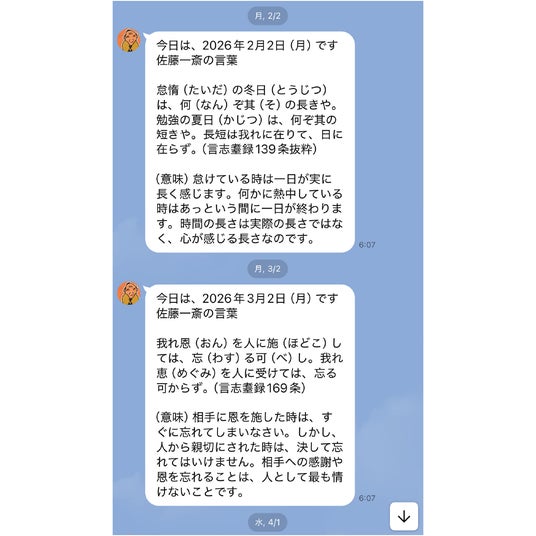 登録後、定期的にあなたのLINEへ佐藤一斎の言葉が届き始めます。