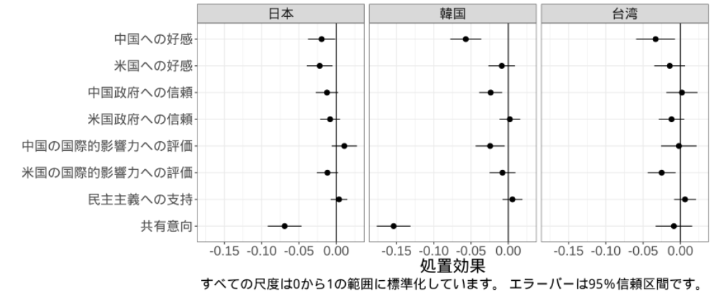 図1は、日本・韓国・台湾の3地域ごとに、中国を持ち上げながら米国を批判する「比較広告」型の「戦狼外交」ツイートに触れたとき、人びとの評価がどの方向にどの程度動いたかを一覧で示したものです。図の左側にあるほど、投稿に触れた人の評価や、投稿を広めたいという気持ちが低いことを示しています。
