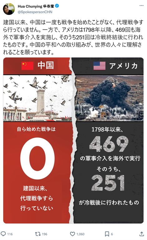 中国は近年、SNSや記者会見を通じて相手国を強く批判しつつ自国の優位性を打ち出す「戦狼外交」と呼ばれる発信を続けており、これは過去の一時的な現象ではなく、現在においても見られる特徴です。なかでも、中国を持ち上げながら米国を批判する「比較広告」型のツイートは、その代表的な形の一つです。
