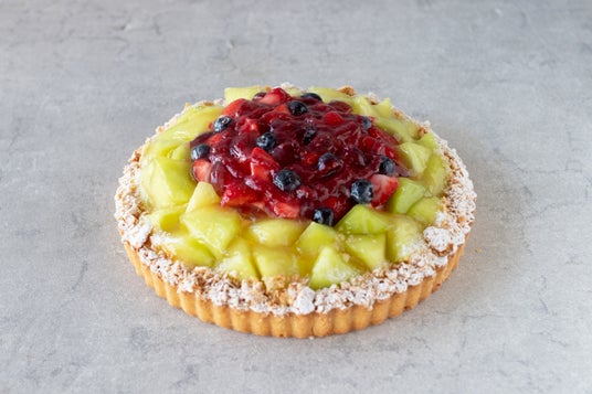 みずみずしいメロンと色鮮やかなミックスベリーを贅沢にあしらった、宝石のように華やかな見た目のタルト。
