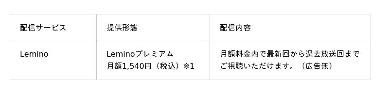 ・「Leminoプレミアム(App Storeでの購入)」「Leminoプレミアム(Google Playでの購入)」「Leminoプレミアムプリペイドカード」「Leminoプレミアム視聴用シリアルコード」をご利用のお客さまは、適用対象外です。
