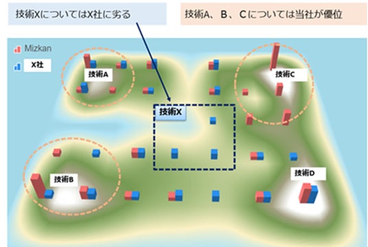 図2:特許ポートフォリオ分析概念図 「特定の技術分野における、ミツカンと同業他社(X社)との、保持特許領域の強み・弱み分析」