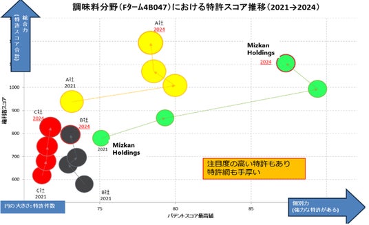 図3:日本の特許庁で公開されている「調味料関連技術」全般(テーマコード:4B047)について、個別特許の注目度を得点化する「パテントスコア(特許分析ツール「Biz Cruncher」)」をベースに分析