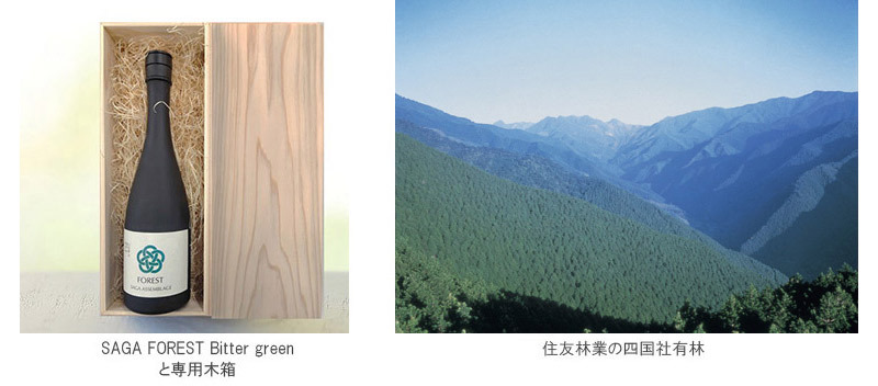 リニューアル商品の一つである日本酒「SAGA FOREST Bitter green」はみずみずしい香りとほのかな苦味が調和した味わいが特長です。「自然との共生」をテーマに、森に包まれるようなひとときを感じられる新たな味わいを追求しました。専用木箱は住友林業グループのスミリンウッドピース株式会社(本社:愛媛県新居浜市)が製造し、住友林業の四国社有林のスギを使用します。