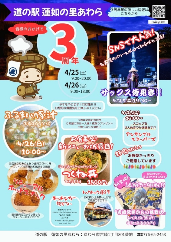道の駅「蓮如の里あわら」では、開駅3周年を記念し、日頃のご愛顧への感謝を込めた「3周年祭」を、4月25日(土)・26日(日)の2日間にわたり開催します。