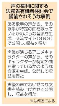 生成人工知能(AI)の急速な普及で生じる声の無断利用への法的対応を協議する法務省の有識者検討会の初会合が24日、開かれた。同省によると、声もパブリシティー権などで保護されるべき「肖像」に含まれるとの認識で一致した。交流サイト(SNS)などでの無断利用が問題になっている歌手や声優の声の権利保護に向けた第一歩を共有した形。