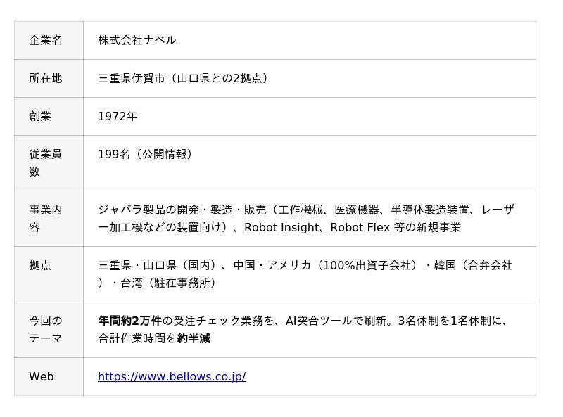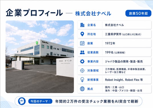 創業50年超・従業員199名の株式会社ナベルが、PDF同士の受注チェック業務にAI突合ツールを導入。OCR断念・採用難・V字回復の三重苦を乗り越えた現場の記録