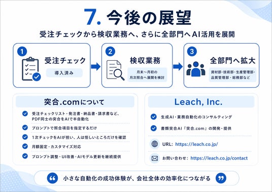 受注チェックよりも確認項目が少ないので、AI の効果が出やすいはずだと見ています。まずはトライアルから始めたいですね。