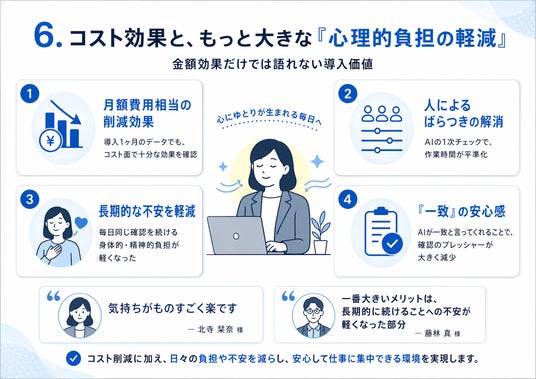 「従来は一言一句、目で追っていました。今は『一致』はAIが言ってくれるので、気持ちがものすごく楽です。時間も、当然短くなります」6. コスト効果と、もっと大きな「心理的負担の軽減」