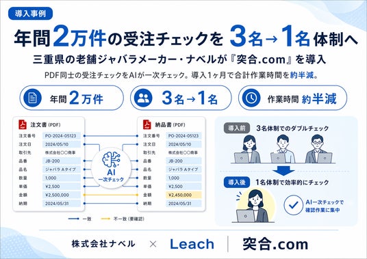三重県伊賀市の老舗ジャバラメーカー・株式会社ナベルは、年間約2万件に上る受注チェック業務を、Leach の書類突合 AI「突合.com」で刷新しました。アナログ(FAX・メール)入力した受注を、人が PDF 同士で突き合わせていた 3 名体制の業務を、導入後わずか1ヶ月で北寺 栞奈 様お一人で対応できる体制に。合計作業時間も約半減しています。現場を統括される藤林 真 課長と、毎日の突合を担当されている北寺様にお話を伺いました。永井 良知 代表取締役社長からは、経営者としての視点を書面でご回答いただいています。