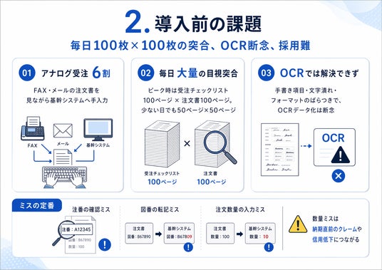 2. 導入前の課題 ── 毎日100枚×100枚の突合、OCR断念、採用難