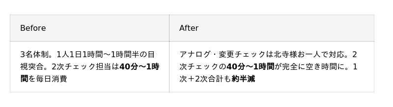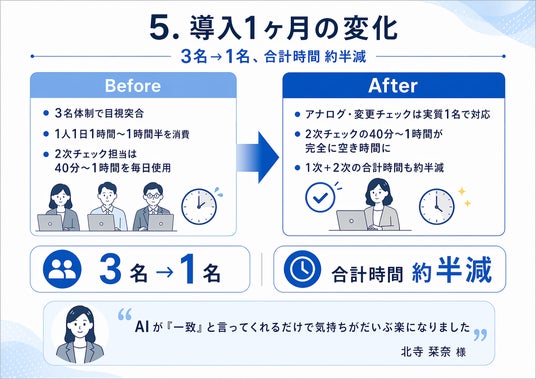 北寺様: 毎日使っていて、AIが「一致」と言ってくれるだけで気持ちがだいぶ楽になりました。以前のように「間違ってないよな」という目で一言一句を追いかけ続けるプレッシャーが、確実に減っています。