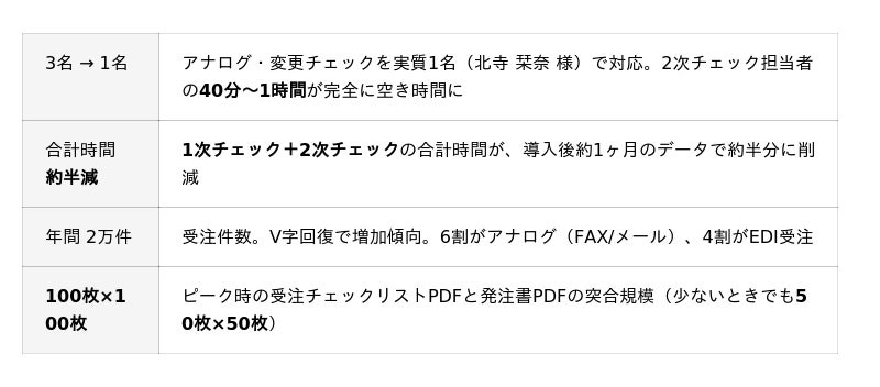 藤林様: 数字で言うと、毎日チェックしていた3名体制が、実質1名体制になりました。変更とアナログのチェックは北寺が1人で対応し、EDI側がもう1名。従来2次チェックに40分~1時間かけていた担当者は、その時間が完全に空き時間となり、他の業務に振り向けられています。
