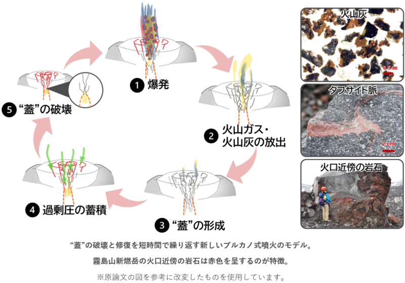 本研究では、霧島山新燃岳において2018年の噴火が終息し、安全が確認された直後の2019年から複数回にわたって、山頂クレーターにたまった溶岩、その中央付近に形成された穴(火口)の内壁およびその周辺の調査を実施しました。そこで、火口の内壁にタフサイト脈が網目状に発達している様子や、火口近傍に大小さまざまなサイズで部分的に赤色に変化している岩塊が分布する様子を見いだしました。この特徴に基づき、爆発によって溶岩の“蓋”が破壊され、残った“蓋”とその内部に多数の割れ目を形成、その後タフサイトが割れ目に貫入し、“蓋”の深部において溶結することで割れ目がすばやく修復され、過剰圧が再蓄積されるという新しいモデルを構築しました。さらに、2018年の噴火の際に採取した赤色の火山灰の特徴と照合することで、この仮説の蓋然性の高さが検証されました。