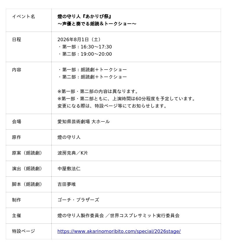 株式会社ワールドエッグス(本社:東京都港区、代表取締役社長:波房克典)と世界最大級のコスプレイベント「世界コスプレサミット」を主催する世界コスプレサミット実行委員会(本社:愛知県名古屋市、実行委員長:小栗徳丸)は、2026年8月1日(土)に愛知県芸術劇場 大ホールにて『あかりび祭』を開催することを決定いたしました。