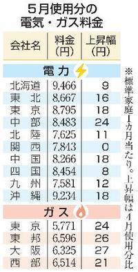 大手電力10社が28日発表した5月使用分(6月請求)の標準家庭向け電気料金は、関西を除く9社が前月に比べて値上がりする。大手都市ガス4社のガス料金は全社で上がる。燃料となる液化天然ガス(LNG)の輸入価格が上昇したため。中東情勢悪化に伴う燃料価格の高騰は6月分以降、本格的に響く見通しだ。